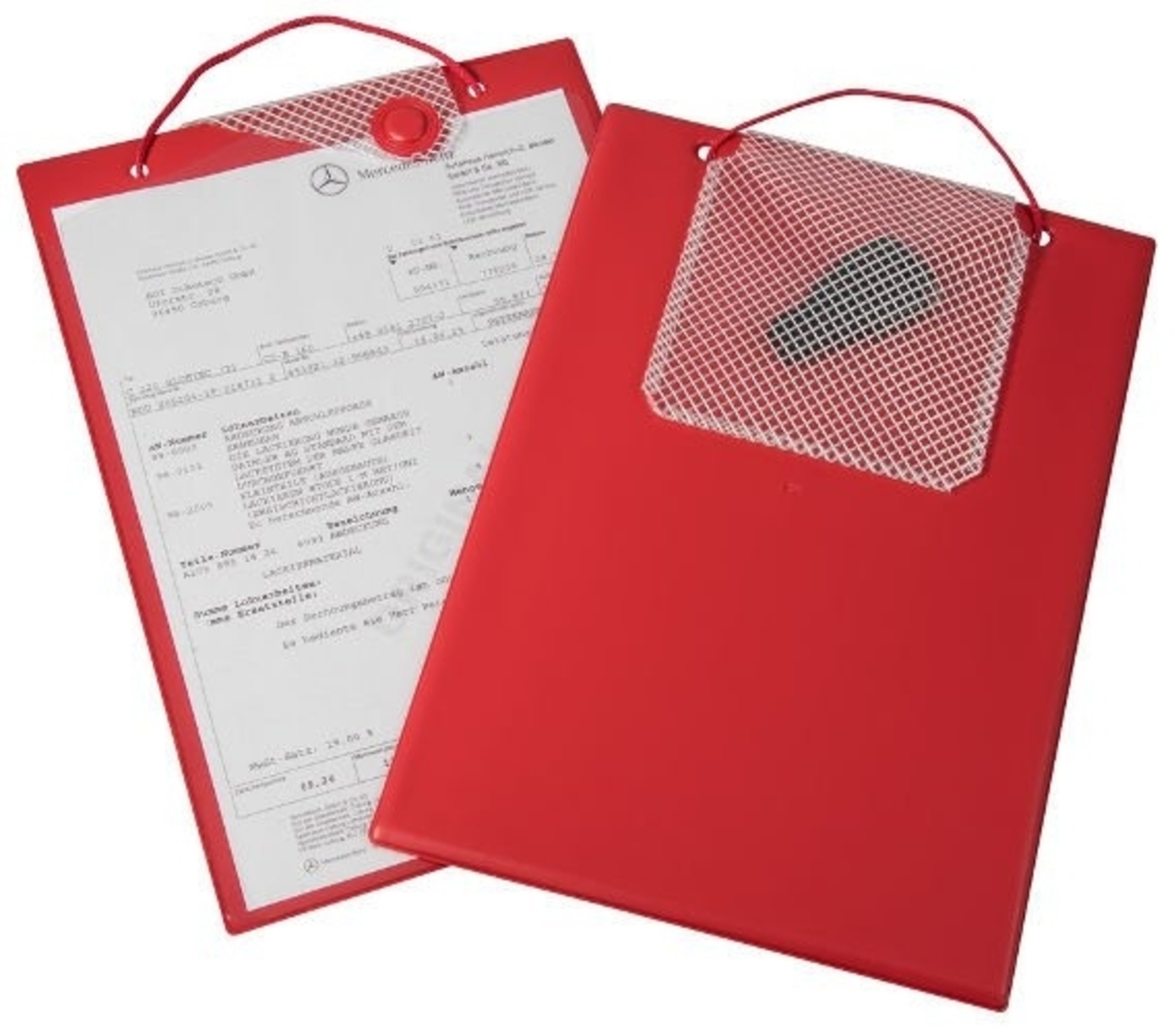 Desky na zakázkové dokumenty (A4) s průhlednou přední fólií, s magnetickým uzávěrem, poutkem na zavěšení a s kapsou na klíče - červená barva.