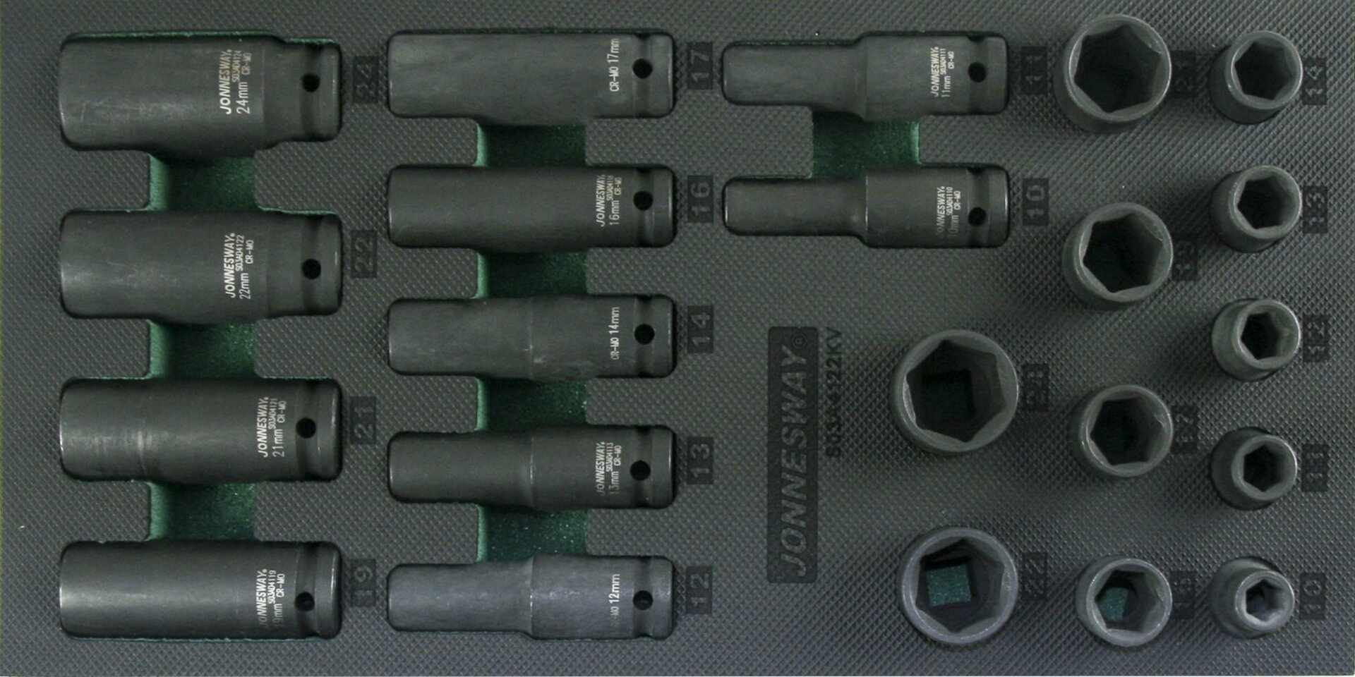 Souprava standardních a prodloužených nástrčných úderových hlavic v pěnovém modulu EVA - JONNESWAY S03A4122KVRozměr vodicího 4hranu: 1/2“