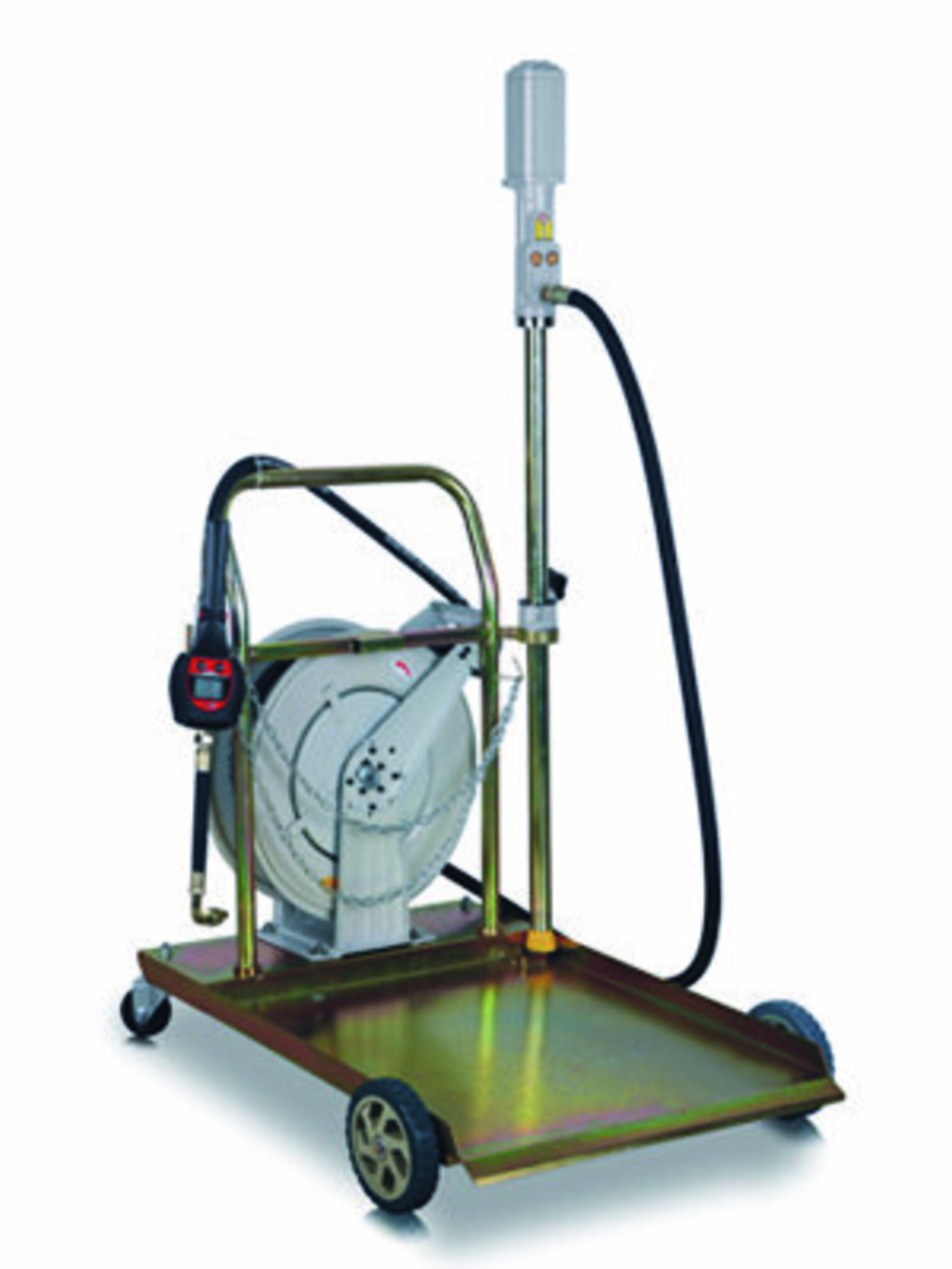 Pojizdná plnička na přečerpávání oleje s čerpadlem do sudu o nosnosti 180-200 kg, s navíjecím bubnem pro hadici